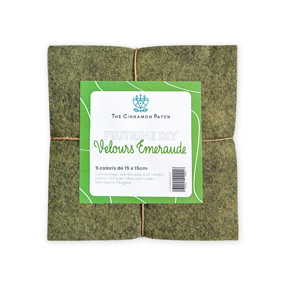 L’assortiment Velours Émeraude comprend 9 carrés de feutrine DIY de couleurs différentes : Camouflage (CP053), Vert mousse (CP040), Vert tendre (CP077), Lichen (CP054), Vert kaki (CP092), Olive (CP039), Vert Loden (CP038), Vert gazon (CP041), Fougère (CP100).